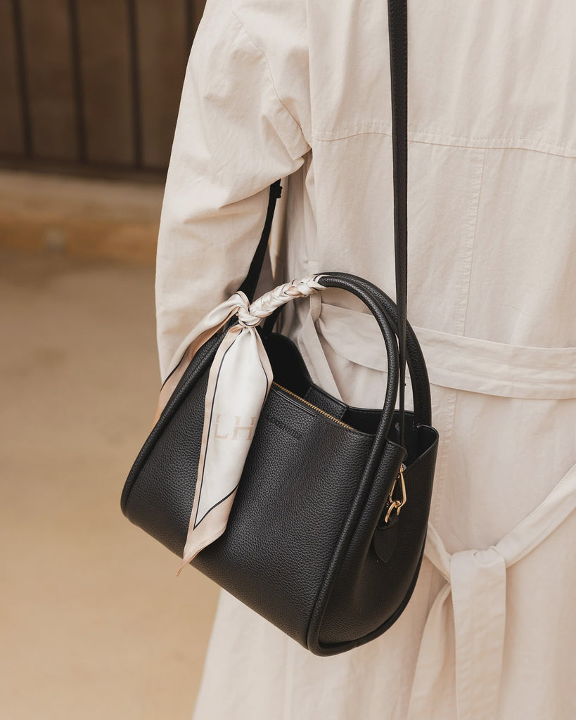 The Steffie Vanilla Mini Tote Bag is an easy-to-compliment silhouette that will become a staple in your wardrobe. Small and elegant, yet spacious enough to carry your everyday must-haves, this women's crossbody bag will keep your essentials in order with the three internal compartments. Offering a versatile wardrobe transformation, simply attach the additional crossbody strap for an effortless over the shoulder, hands-free style, or carry her by the top handles for an elevated going-out style. To further enhance your winter style, this handbag features a braided silk-feel scarf over the handle to bring a touch of sophistication to your ensemble.